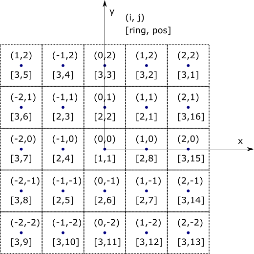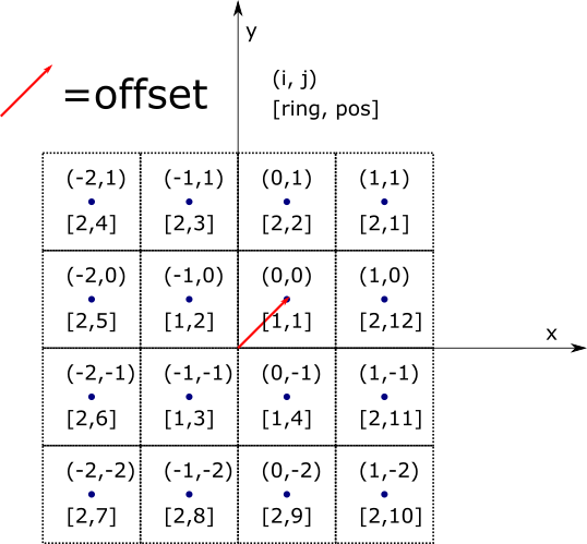 Grid example where the axes lie between the “center assemblies” (even-by-even). Note that ring 1 has four locations, and that the center of the (0, 0)-index location is offset from the origin.